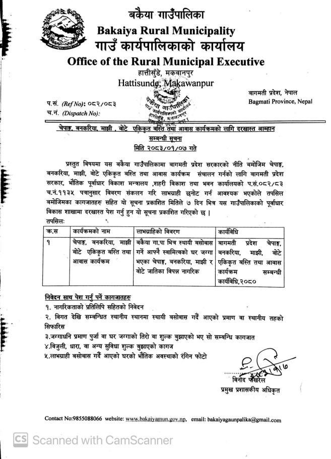चेपाङ, वनकरियावनकरिया,माझी, वोटे एकिकृत बस्ती तथा आवास कार्यक्रमको लागि दर्खास्त आव्हान सम्बन्धी सूचना।