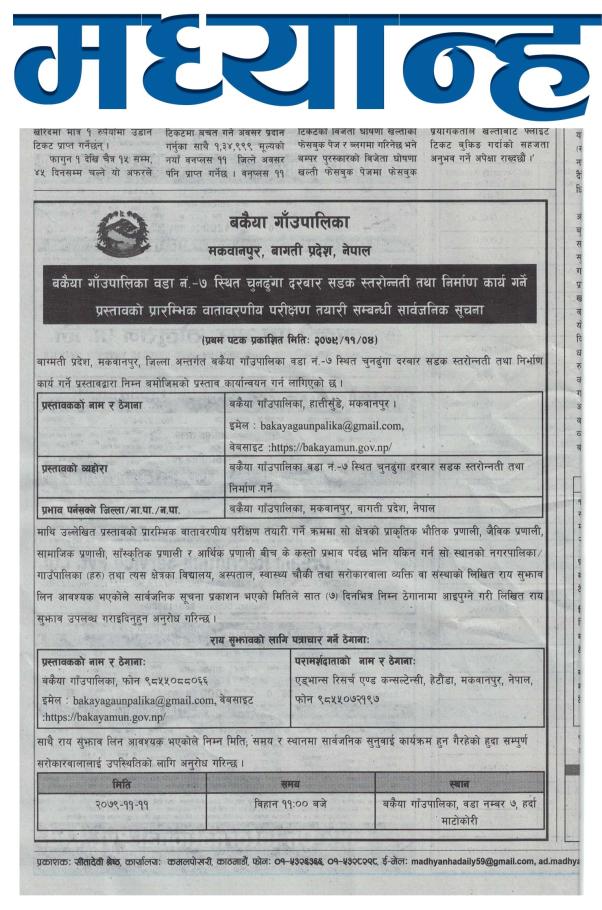 बकैया गाँउपालिका वडा नं.-७ स्थित चुनढुंगा दरबार सडक स्तरोन्नती तथा निर्माण कार्य गर्ने प्रस्तावको प्रारम्भिक वातावरणीय परीक्षण तयारी सम्बन्धी सार्वजनिक सूचना