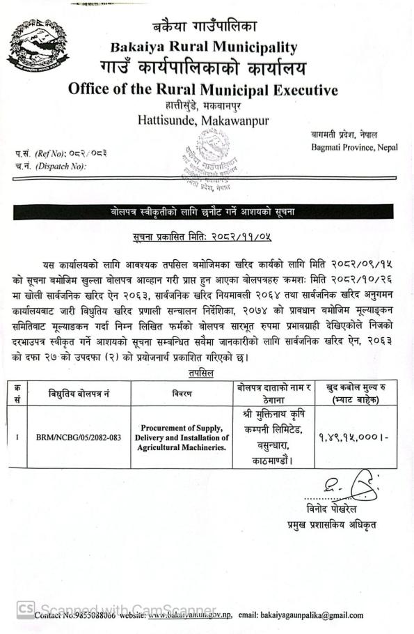 » बोलपत्र स्वीकृतीको लागि छनौट गर्ने आशयको सूचना।