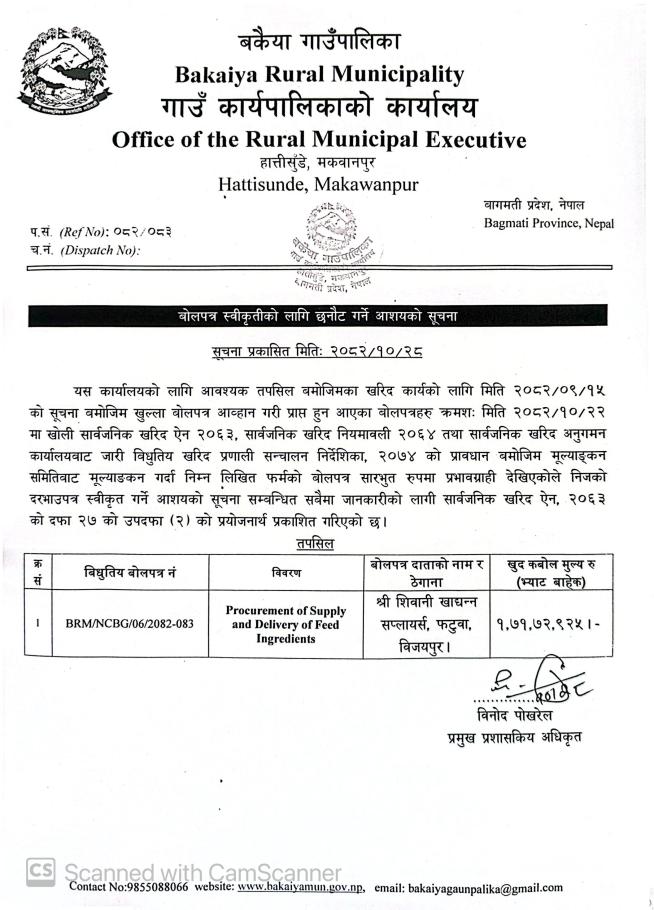 बोलपत्र स्वीकृतीको लागि छनौट गर्ने आशयको सूचना।