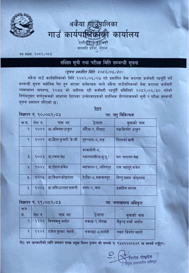 संक्षिप्त सूची तथा परिक्षा मिति सम्बन्धि सूचना !!!